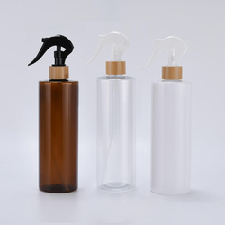 स्पष्ट एम्बर ब्लू ब्लैक व्हाइट पालतू प्लास्टिक कॉस्मेटिक बोतल के साथ लकड़ी के बांस ट्रिगर स्प्रे नोजल कैप